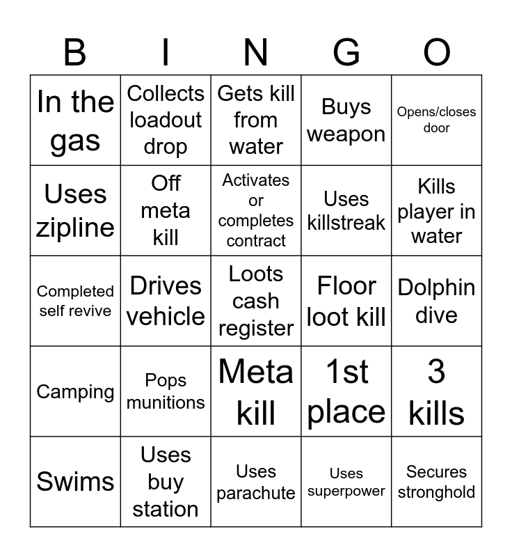 This bingo card has 25 words: Pops munitions, Uses parachute, Activates or completes contract, Swims, Opens/closes door, In the gas, Uses zipline, Collects loadout drop, Floor loot kill, Meta kill, Uses killstreak, Completed self revive, 1st place, 3 kills, Off meta kill, Secures stronghold, Dolphin dive, Gets kill from water, Kills player in water, Drives vehicle, Loots cash register, Uses buy station, Camping, Buys weapon and Uses superpower.