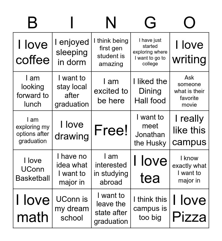 This bingo card has a free space and 24 words: I have no idea what I want to major in, UConn is my dream school, I am excited to be here, I love math, I love writing, I love coffee, I am looking forward to lunch, I enjoyed sleeping in dorm, I want to meet Jonathan the Husky, I am interested in studying abroad, I liked the Dining Hall food, I am exploring my options after graduation, I love tea, I know exactly what I want to major in, I want to stay local after graduation, I think this campus is too big, I really like this campus, I think being first gen student is amazing, Ask someone what is their favorite movie, I love drawing, I love Pizza, I love UConn Basketball, I have just started exploring where I want to go to college and I want to leave the state after graduation.