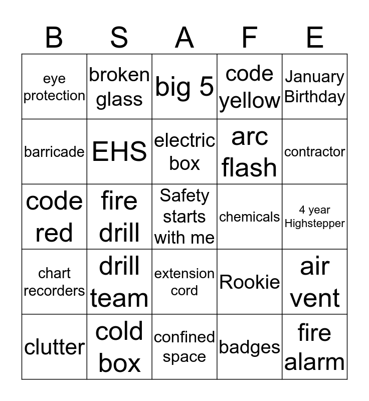 This bingo card has a free space and 28 words: air vent, alarm system, arc flash, badges, barricade, big 5, broken glass, chart recorders, chemicals, clutter, code red, code yellow, cold box, confined space, contractor, deviation, drill team, EHS, electric box, extension cord, eye protection, fall protections, fire alarm, fire drill, 4 year Highstepper, Rookie, January Birthday and Someone with their own car.