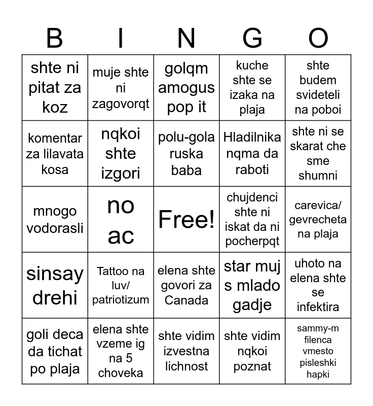 This bingo card has a free space and 24 words: Tattoo na luv/ patriotizum, elena shte vzeme ig na 5 choveka, polu-gola ruska baba, goli deca da tichat po plaja, shte budem svideteli na poboi, shte ni pitat za koz, komentar za lilavata kosa, muje shte ni zagovorqt, chujdenci shte ni iskat da ni pocherpqt, elena shte govori za Canada, Hladilnika nqma da raboti, mnogo vodorasli, star muj s mlado gadje, uhoto na elena shte se infektira, nqkoi shte izgori, shte vidim nqkoi poznat, carevica/ gevrecheta na plaja, golqm amogus pop it, shte ni se skarat che sme shumni, no ac, sammy-m filenca vmesto pisleshki hapki, sinsay drehi, kuche shte se izaka na plaja and shte vidim izvestna lichnost.
