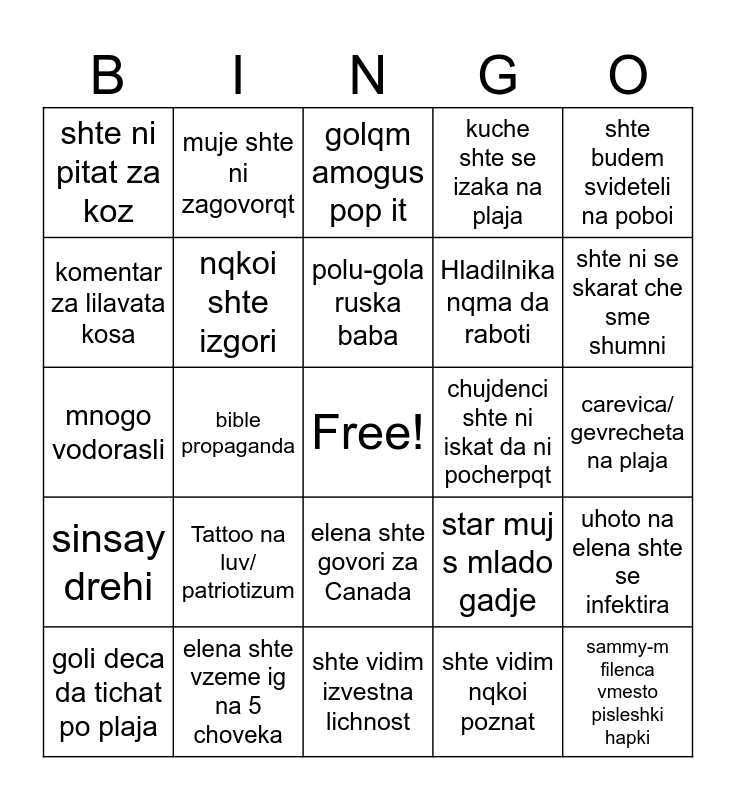 This bingo card has a free space and 24 words: Tattoo na luv/ patriotizum, elena shte vzeme ig na 5 choveka, polu-gola ruska baba, goli deca da tichat po plaja, shte budem svideteli na poboi, shte ni pitat za koz, komentar za lilavata kosa, muje shte ni zagovorqt, chujdenci shte ni iskat da ni pocherpqt, elena shte govori za Canada, Hladilnika nqma da raboti, mnogo vodorasli, star muj s mlado gadje, uhoto na elena shte se infektira, nqkoi shte izgori, shte vidim nqkoi poznat, carevica/ gevrecheta na plaja, golqm amogus pop it, shte ni se skarat che sme shumni, bible propaganda, sammy-m filenca vmesto pisleshki hapki, sinsay drehi, kuche shte se izaka na plaja and shte vidim izvestna lichnost.