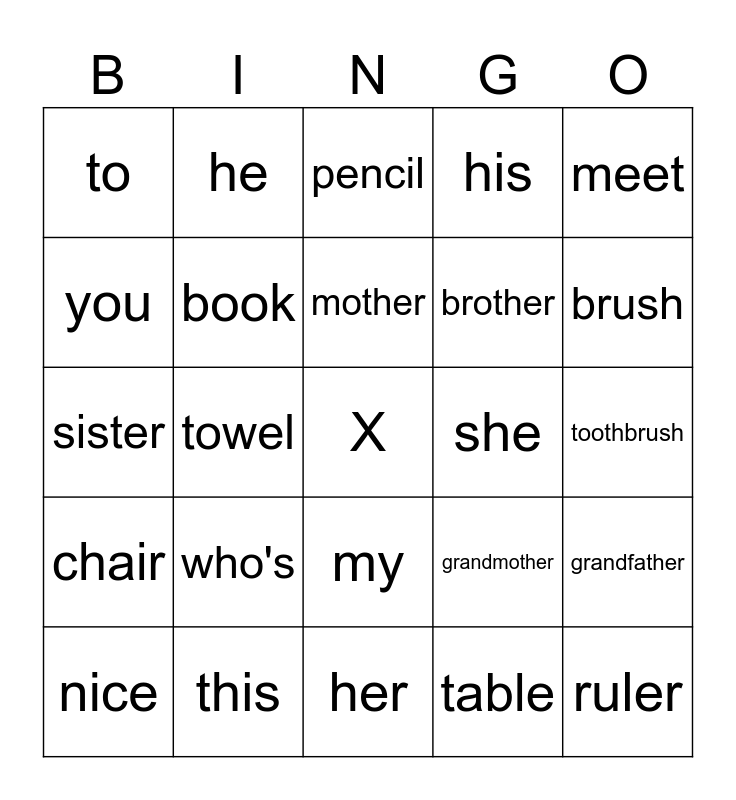 This bingo card has a free space and 24 words: who's, this, mother, nice, meet, to, you, he, she, my, brother, sister, grandmother, grandfather, book, table, toothbrush, pencil, brush, towel, ruler, chair, his and her.