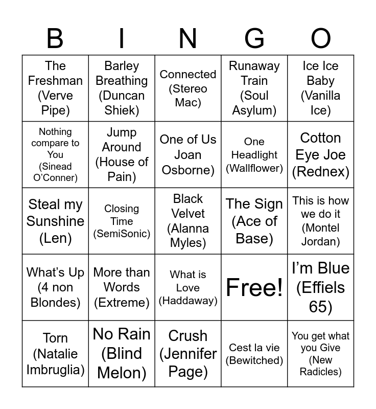 This bingo card has 25 words: More than Words (Extreme), Crush (Jennifer Page), One of Us Joan Osborne), Torn (Natalie Imbruglia), Ice Ice Baby (Vanilla Ice), The Freshman (Verve Pipe), Nothing compare to You (Sinead O’Conner), Barley Breathing (Duncan Shiek), The Sign (Ace of Base), What is Love (Haddaway), One Headlight (Wallflower), Steal my Sunshine (Len), Free!, I’m Blue (Effiels 65), Jump Around (House of Pain), You get what you Give (New Radicles), This is how we do it (Montel Jordan), Connected (Stereo Mac), Cotton Eye Joe (Rednex), Closing Time (SemiSonic), Black Velvet (Alanna Myles), No Rain (Blind Melon), What’s Up (4 non Blondes), Runaway Train (Soul Asylum) and Cest la vie (Bewitched).