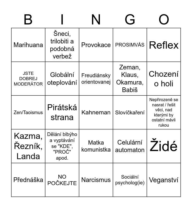 This bingo card has a free space and 24 words: Dělání blbýho a vyptávání se "KDE", "PROČ" apod., NO POČKEJTE, Freudiánsky orientovanej, Přednáška, Reflex, Marihuana, JSTE DOBREJ MODERÁTOR, Šneci, trilobiti a podobná verbež, Slovíčkaření, Matka komunistka, Zeman, Klaus, Okamura, Babiš, Zen/Taoismus, Celulární automaton, Židé, Globální oteplování, Sociální psycholog(ie), Nepřirozeně se nasrat / řešit věci, nad kterými by ostatní mávli rukou, Provokace, Chození o holi, Pirátská strana, Veganství, Kazma, Řezník, Landa, PROSIMVÁS and Narcismus.