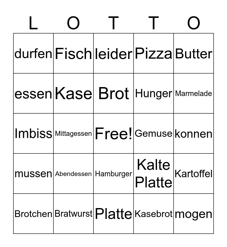 This bingo card has a free space and 24 words: Abendessen, Bratwurst, Brot, Brotchen, Butter, durfen, essen, Fisch, Gemuse, Hamburger, Hunger, Imbiss, Kalte Platte, Kartoffel, Kase, Kasebrot, konnen, leider, Marmelade, Mittagessen, mogen, mussen, Pizza and Platte.