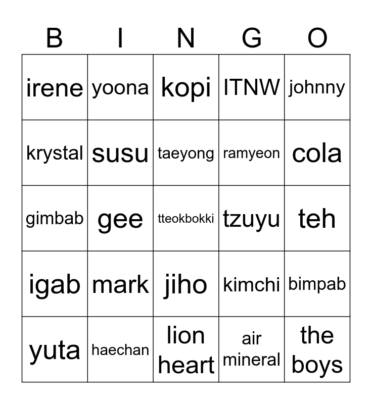 This bingo card has a free space and 24 words: mark, haechan, taeyong, yuta, johnny, irene, krystal, yoona, tzuyu, jiho, ramyeon, gimbab, kimchi, bimpab, susu, air mineral, teh, kopi, cola, gee, the boys, igab, ITNW and lion heart.