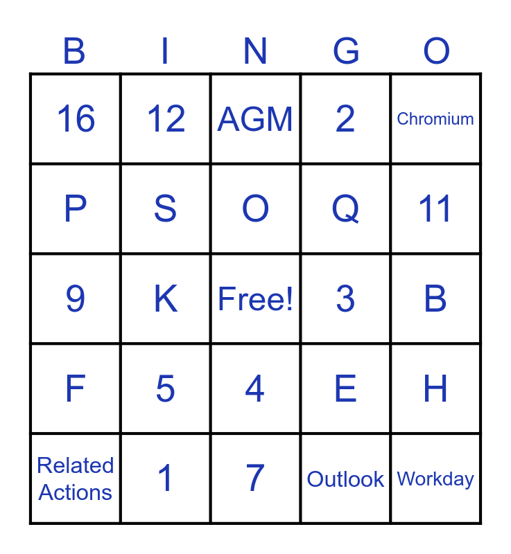 This bingo card has a free space and 44 words: Jon Brady, Workday, Hubspot, Related Actions, test, Outlook, AGM, kidtown, Chromium, 1, 2, 3, 4, 5, 6, 7, 8, 9, 0, 11, 12, 13, 14, 16, A, B, C, D, E, F, G, H, I, J, K, L, M, N, O, P, Q, R, S and T.