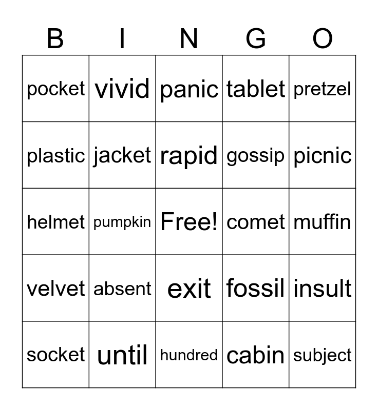 This bingo card has a free space and 25 words: absent, hundred, rapid, socket, pretzel, pocket, plastic, vivid, comet, exit, gossip, helmet, fossil, insult, jacket, magnet, muffin, panic, picnic, pumpkin, subject, until, velvet, tablet and cabin.