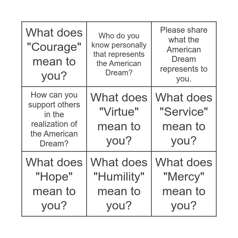 This bingo card has 9 words: What does "Hope" mean to you?, Please share what the American Dream represents to you., Who do you know personally that represents the American Dream?, How can you support others in the realization of the American Dream?, What does "Courage" mean to you?, What does "Service" mean to you?, What does "Virtue" mean to you?, What does "Mercy" mean to you? and What does "Humility" mean to you?.