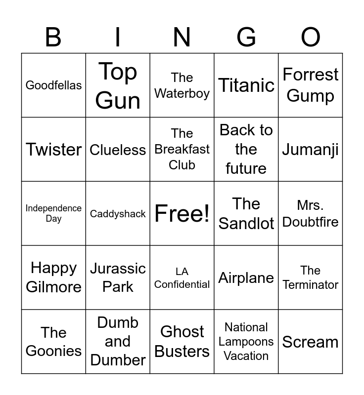 This bingo card has a free space and 24 words: Jurassic Park, Dumb and Dumber, The Breakfast Club, The Goonies, Forrest Gump, Goodfellas, Twister, Top Gun, The Sandlot, LA Confidential, Back to the future, Independence Day, Airplane, The Terminator, Clueless, National Lampoons Vacation, Mrs. Doubtfire, The Waterboy, Jumanji, Caddyshack, Scream, Happy Gilmore, Titanic and Ghost Busters.