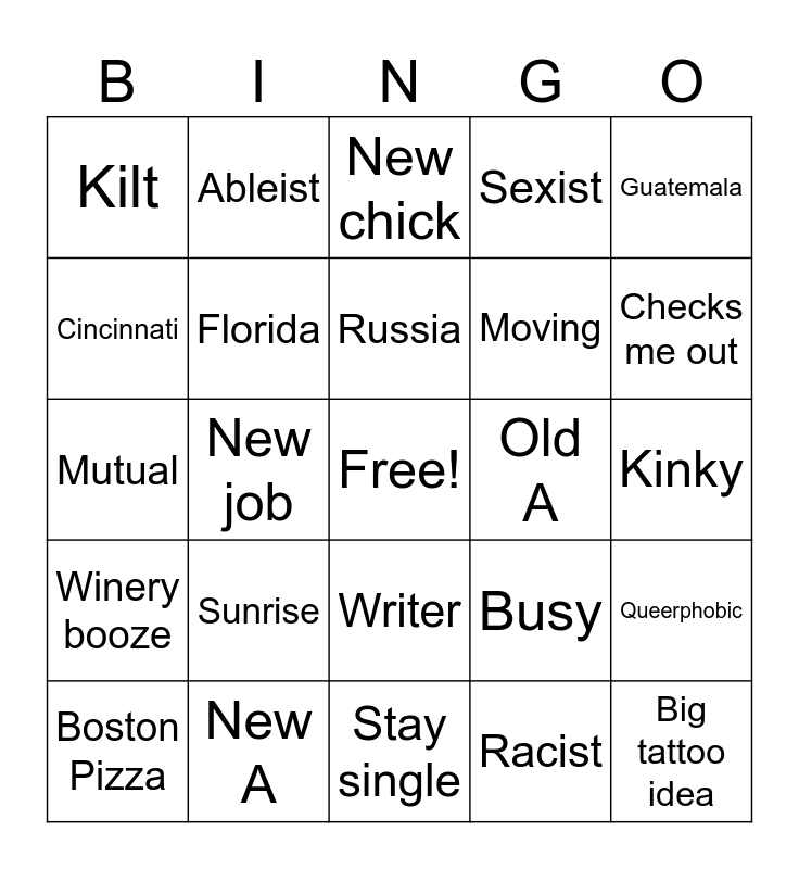 This bingo card has a free space and 24 words: Sunrise, New A, Russia, Boston Pizza, Guatemala, Kilt, Cincinnati, Ableist, Old A, Writer, Moving, Mutual, Busy, Queerphobic, Florida, Racist, Kinky, New chick, Checks me out, New job, Big tattoo idea, Winery booze, Sexist and Stay single.
