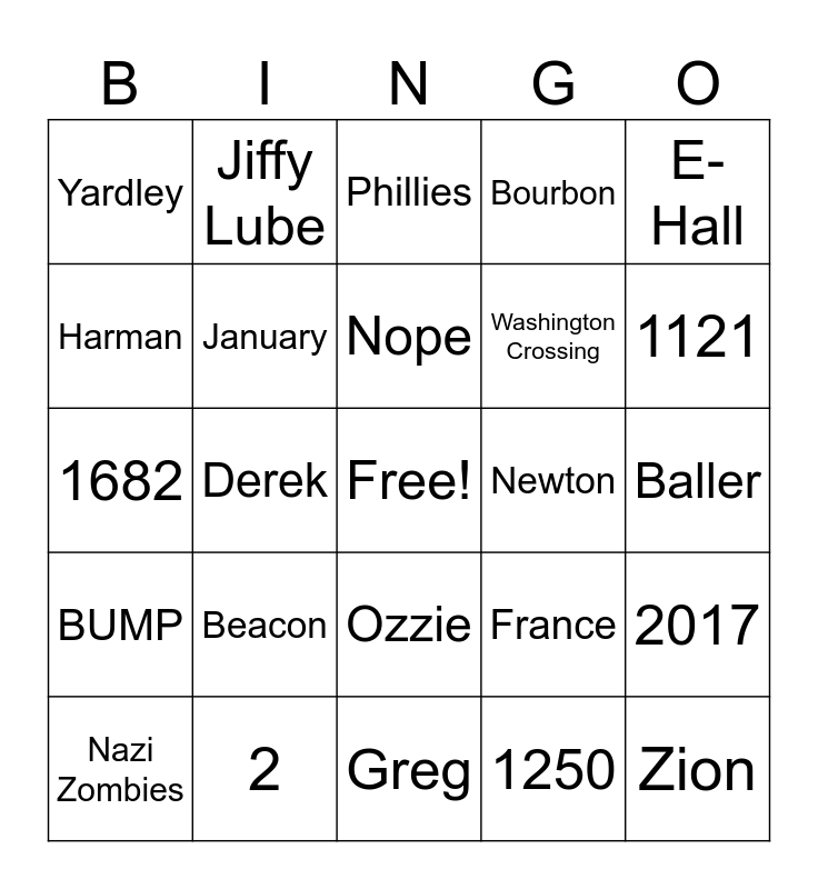 This bingo card has a free space and 54 words: 3428, BUMP, 154, 2021, Ozzie, Vest / Life Preserver, Bourbon, 39, Harman, 6, Yardley, Freehold NJ, 2, Nazi Zombies, 7, Greg, Zion, Washington Crossing, 8, Baller, France, Goat Hill, Newton, E-Hall, The Last Horrah, Jiffy Lube, True, False, Spain, 1250, Landscape Architecture, Ram, 9, Oceanport, Phillies, Jetro, 1682, 2017, August, January, Haddon, Gutman, Delassandros, Manayunk, Beacon, William Penn, Wissahickon, 1952, Nope, Derek, 1121, 2080, 1884 and Yeah Baby.