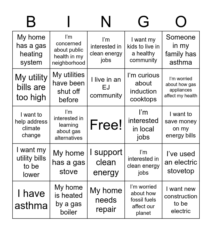 This bingo card has a free space and 24 words: My home has a gas stove, My home is heated by a gas boiler, I live in an EJ community, I have asthma, Someone in my family has asthma, My home has a gas heating system, My utility bills are too high, I’m concerned about public health in my neighborhood, I’m interested in local jobs, I support clean energy, I’m curious about induction cooktops, I want to help address climate change, I’m interested in clean energy jobs, I’ve used an electric stovetop, My utilities have been shut off before, I’m worried about how fossil fuels affect our planet, I want to save money on my energy bills, I’m interested in clean energy jobs, I’m worried about how gas appliances affect my health, I’m interested in learning about gas alternatives, I want new construction to be electric, I want my utility bills to be lower, I want my kids to live in a healthy community and My home needs repair.
