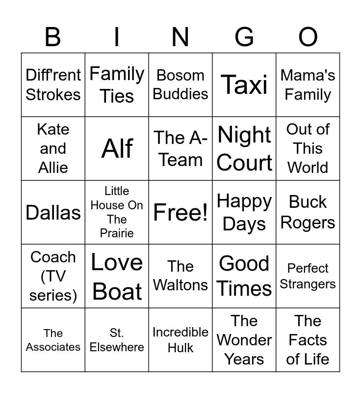 This bingo card has a free space and 60 words: Seinfeld, St. Elsewhere, Saved by the Bell, Coach (TV series), The Wonder Years, Full House, Alf, 21 Jump Street, Night Court, The Golden Girls, Taxi, Who's the Boss?, Kate and Allie, Growing Pains, Only Fools and Horses, Diff'rent Strokes, The Facts of Life, Mama's Family, Major Dad, The A-Team, Happy Days, Bosom Buddies, The Associates, Perfect Strangers, Three's Company, Kung Fu, Empty Nest, Anything but Love, Out of This World, Moonlighting, Family Matters, Cheers, Saturday Night Live, Married with Children, Family Ties, MASH, Columbo, Little House On The Prairie, Dukes Of Hazzard, Dallas, WKRP in Cincinnati, Love Boat, Buck Rogers, Laverne & Shirley, Good Times, Partridge Family, Barney Miller, CHIPS, All In The Family, The Waltons, Incredible Hulk, Benson, Jeffersons, Wonder Woman, All My Children, One Day At A Time, Battlestar Glactica, SOAP, Charlie's Angels and Alice.