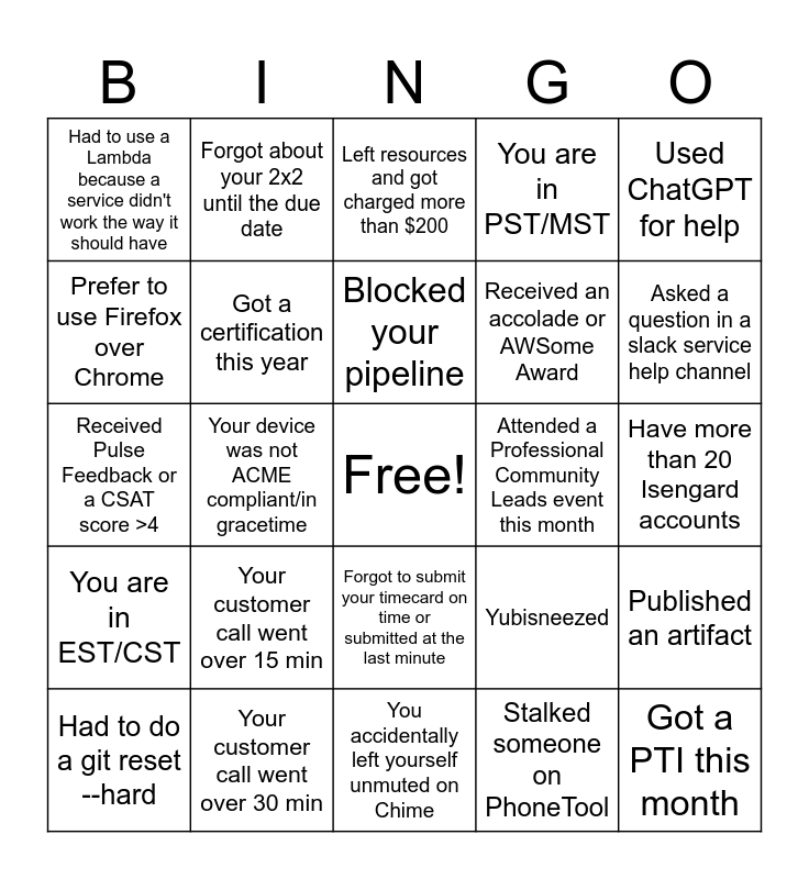 This bingo card has a free space and 24 words: Your customer call went over 15 min, Your customer call went over 30 min, Blocked your pipeline, Had to do a git reset --hard, Used ChatGPT for help, Had to use a Lambda because a service didn't work the way it should have, Prefer to use Firefox over Chrome, Forgot about your 2x2 until the due date, Attended a Professional Community Leads event this month, Forgot to submit your timecard on time or submitted at the last minute, Received an accolade or AWSome Award, Received Pulse Feedback or a CSAT score >4, Yubisneezed, Published an artifact, Got a certification this year, Stalked someone on PhoneTool, Have more than 20 Isengard accounts, Left resources and got charged more than $200, Asked a question in a slack service help channel, Your device was not ACME compliant/in gracetime, Got a PTI this month, You are in EST/CST, You are in PST/MST and You accidentally left yourself unmuted on Chime.