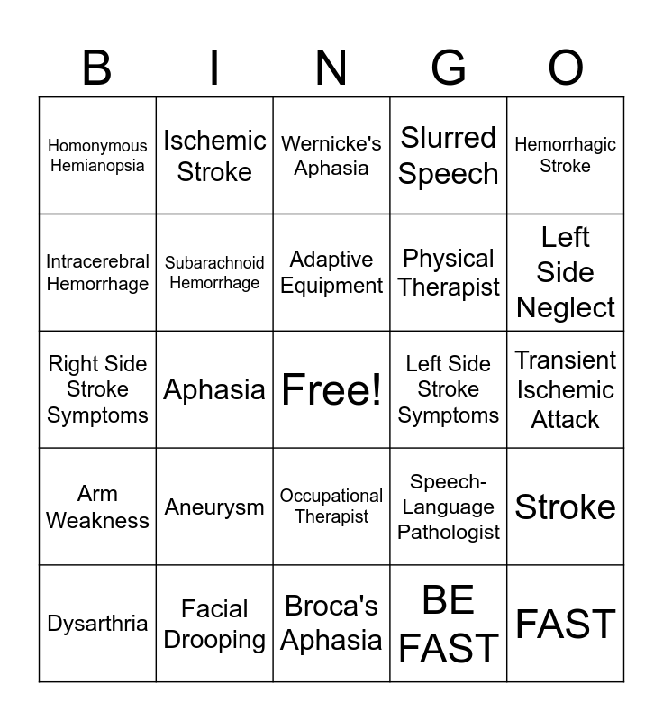 This bingo card has a free space and 25 words: Aneurysm, Broca's Aphasia, Adaptive Equipment, Dysarthria, Hemorrhagic Stroke, Homonymous Hemianopsia, Intracerebral Hemorrhage, Ischemic Stroke, Left Side Stroke Symptoms, Occupational Therapist, Physical Therapist, Right Side Stroke Symptoms, Speech-Language Pathologist, Stroke, Subarachnoid Hemorrhage, Thrombotic Clot, Transient Ischemic Attack, Wernicke's Aphasia, Left Side Neglect, Aphasia, FAST, Facial Drooping, Arm Weakness, Slurred Speech and BE FAST.