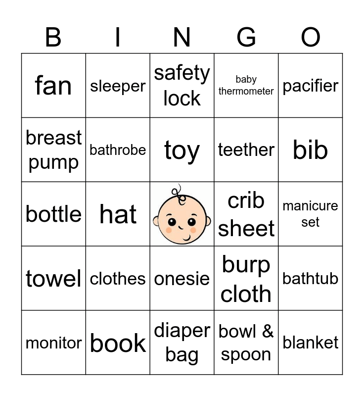This bingo card has a free space and 24 words: clothes, book, toy, monitor, pacifier, fan, breast pump, sleeper, crib sheet, onesie, teether, bottle, burp cloth, bathtub, bathrobe, bowl & spoon, manicure set, safety lock, bib, hat, blanket, towel, baby thermometer and diaper bag.