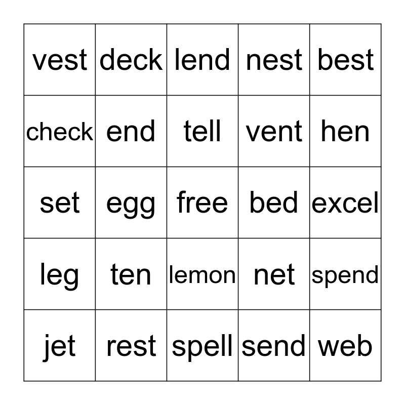 This bingo card has a free space and 24 words: ten, rest, tell, jet, best, vest, check, deck, bed, lemon, vent, set, net, spend, end, send, excel, lend, hen, egg, web, leg, nest and spell.