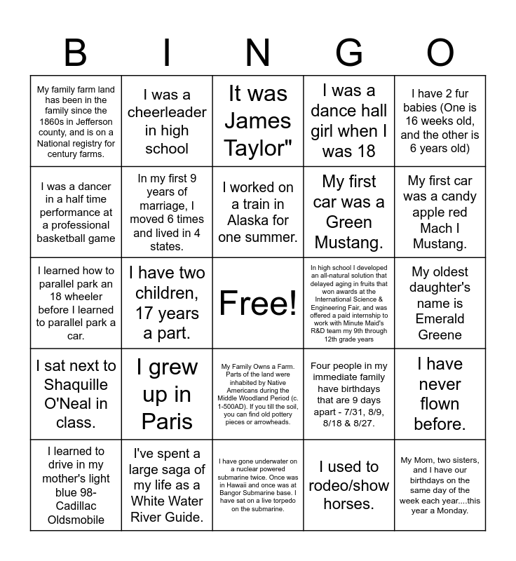 This bingo card has a free space and 41 words: I took 5 years of dance when I was younger - and I was a cheerleader in jr/high school!, I learned how to parallel park an 18 wheeler before I learned to parallel park a car., I once fell asleep on a plane and started screaming when we landed... because I thought we were crashing., In my first 9 years of marriage, I moved 6 times and lived in 4 states., I've spent a large saga of my life as a White Water River Guide., My Family Owns a Farm. Parts of the land were inhabited by Native Americans during the Middle Woodland Period (c. 1-500AD). If you till the soil, you can find old pottery pieces or arrowheads., I worked on a train in Alaska for one summer., I love animals and have 3 cats and 2 dogs. I'll probably lose a hand some day by petting something I shouldn't., I have 2 fur babies (One is 16 weeks old, and the other is 6 years old), I sat next to Shaquille O'Neal in class., I have two children, 17 years a part., I was a dance hall girl when I was 18, My Mom, two sisters, and I have our birthdays on the same day of the week each year....this year a Monday., My oldest daughter's name is Emerald Greene, In high school I developed an all-natural solution that delayed aging in fruits that won awards at the International Science & Engineering Fair, and was offered a paid internship to work with Minute Maid's R&D team my 9th through 12th grade years, I grew up in Paris, When I was 12 years old, I was featured on Chuck Dovish's Travelin' Arkansas segment on KTHV, My family farm land has been in the family since the 1860s in Jefferson county, and is on a National registry for century farms., "I met and had a sit down visit with my favorite singer 2x, saw him 4x in concert, It was James Taylor", I have never flown before., I know how to play the flute., I have gone underwater on a nuclear powered submarine twice. Once was in Hawaii and once was at Bangor Submarine base. I have sat on a live torpedo on the submarine., My first car was a Green Mustang., I go to a minimum of 8 haunted houses for Halloween each year., I became a grandparent at the age of 32, I used to rodeo/show horses., I lived in 9 places by the time I was 11 years old., My first car was a candy apple red Mach I Mustang., I have never rode on a civilian aircraft., My first language growing up was Spanish. It wasn't until I started middle school that I began to understand and speak English., I was a cheerleader in high school, I learned to drive in my mother's light blue 98- Cadillac Oldsmobile, When I was a child I was so scared of dogs, I wouldn't even go outside of my house. Now I am an avid dog lover!, Four people in my immediate family have birthdays that are 9 days apart - 7/31, 8/9, 8/18 & 8/27., I was a dancer in a half time performance at a professional basketball game, I collect several different series of Keepsake Hallmark Christmas ornaments., When I was little we were on a trip to Oceans Of Fun (Kansas City) and I was chosen out of the crowd to go on stage. I got to pet a dolphin, ride around in a little raft in the tank, and feed the dolphin a fish. After petting the dolphin I was th, I love dragonflies, I love Horseracing! and I've performed as a Spice Girl!.