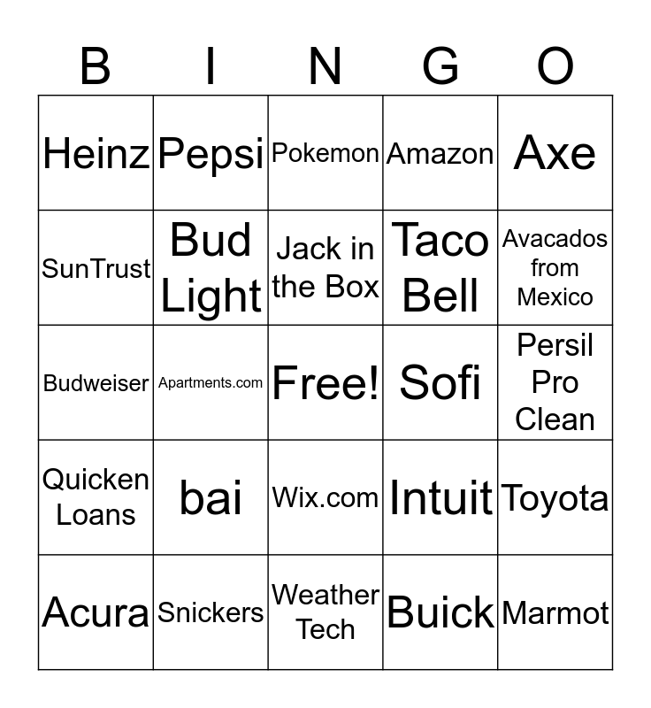 This bingo card has a free space and 40 words: Skittles, Budweiser, Doritos, Bud Light, Snickers, Wix.com, Jack in the Box, T-Mobile, Axe, Quicken Loans, Apartments.com, Amazon, Marmot, Persil Pro Clean, Sofi, bai, Audi, Heinz, Michelob Ultra, Pokemon, Toyota, Buick, Taco Bell, SunTrust, Mini Cooper, Colgate, PayPal, LG, Butterfinger, Hyundai, Honda, Acura, TurboTax, Intuit, Avacados from Mexico, Weather Tech, Kia, Mountain Dew, Pepsi and Coca-Cola.