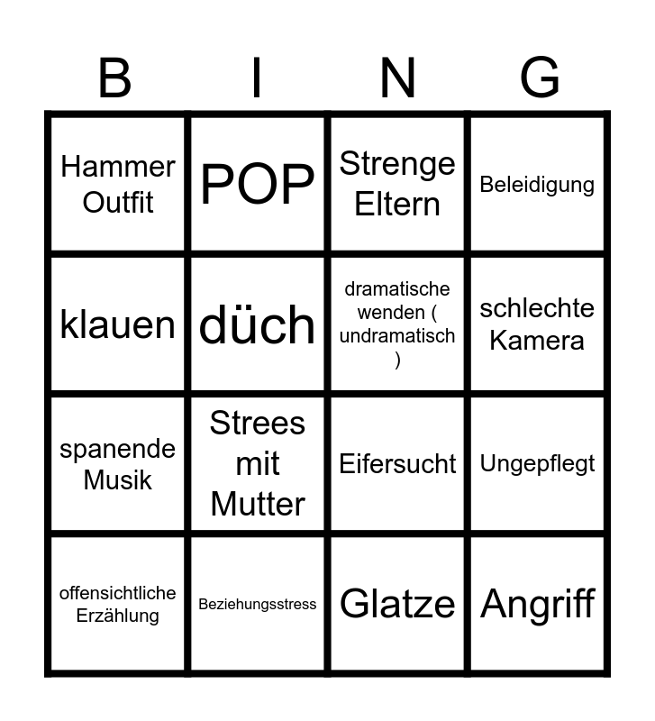 This bingo card has 16 words: Beziehungsstress, Ungepflegt, Strenge Eltern, Hammer Outfit, spanende Musik, POP, Eifersucht, Glatze, klauen, düch, offensichtliche Erzählung, Beleidigung, Strees mit Mutter, schlechte Kamera, dramatische wenden ( undramatisch ) and Angriff.