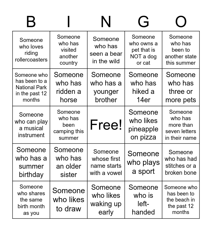 This bingo card has a free space and 25 words: Someone who shares the same birth month as you, Someone who has an older sister, Someone who has a younger brother, Someone who is left-handed, Someone who has three or more pets, Someone who loves riding rollercoasters, Someone who has visited another country, Someone who has seen a bear in the wild, Someone who has hiked a 14er, Someone who has had stitches or a broken bone, Someone who can play a musical instrument, Someone who has ridden a horse, Someone who plays a sport, Someone who has been to the beach in the past 12 months, Someone who has been to a National Park in the past 12 months, Someone who likes to draw, Someone who likes waking up early, Someone who owns a pet that is NOT a dog or cat, Someone who has more than seven letters in their name, Someone who has a summer birthday, Someone who has been camping this summer, Someone whose first name starts with a vowel, Someone who likes pineapple on pizza, Someone who has been to another state this summer and Someone who is the same grade as you.