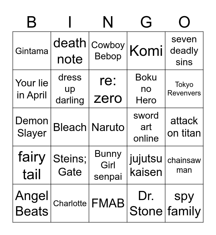 This bingo card has a free space and 24 words: Steins; Gate, Charlotte, re: zero, Angel Beats, seven deadly sins, Gintama, Your lie in April, death note, sword art online, Bunny Girl senpai, Boku no Hero, Demon Slayer, jujutsu kaisen, chainsaw man, dress up darling, Dr. Stone, attack on titan, Cowboy Bebop, Tokyo Revenvers, Bleach, spy family, fairy tail, Komi and FMAB.