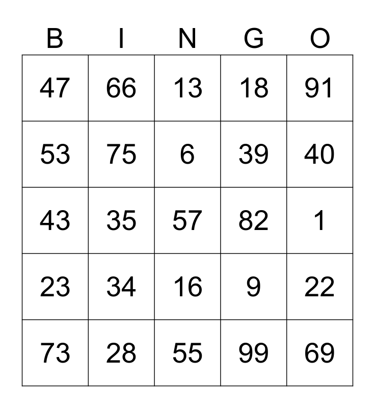 This bingo card has a free space and 24 words: 34, 28, 6, 73, 91, 47, 53, 66, 82, 16, 39, 43, 9, 22, 75, 99, 1, 13, 40, 35, 69, 23, 18 and 55.