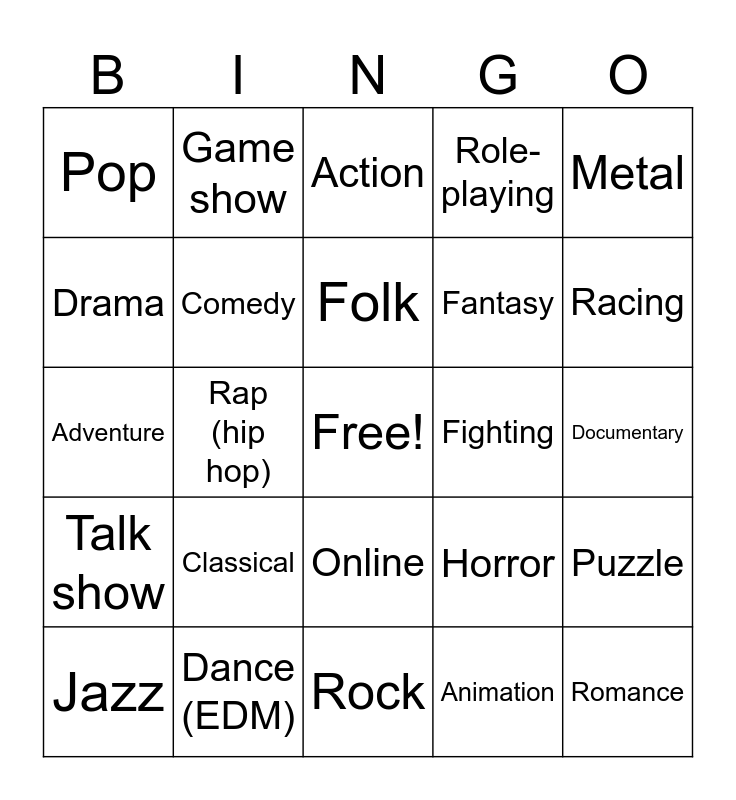 This bingo card has a free space and 24 words: Classical, Dance (EDM), Folk, Jazz, Metal, Pop, Drama, Game show, Fighting, Online, Fantasy, Adventure, Horror, Puzzle, Comedy, Animation, Documentary, Action, Racing, Rap (hip hop), Romance, Talk show, Role-playing and Rock.