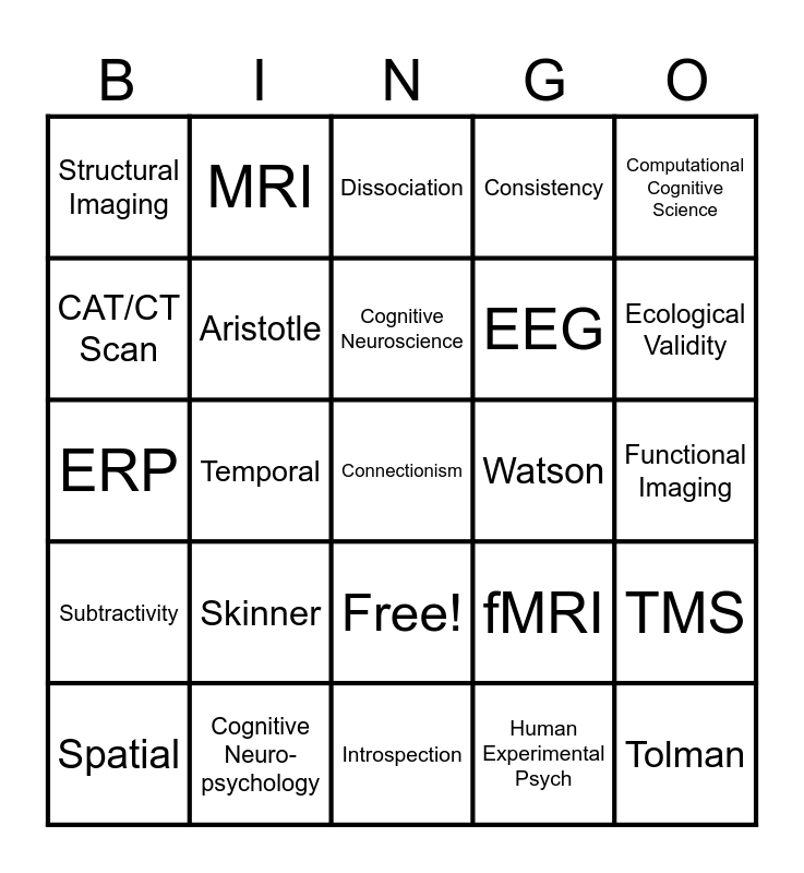 This bingo card has 26 words: Free!, Human Experimental Psych, Cognitive Neuroscience, Cognitive Neuro- psychology, Computational Cognitive Science, Structural Imaging, CAT/CT Scan, MRI, Functional Imaging, fMRI, EEG, ERP, TMS, Spatial, Temporal, Modularity, Consistency, Subtractivity, Dissociation, Connectionism, Ecological Validity, Introspection, Watson, Skinner, Aristotle and Tolman.