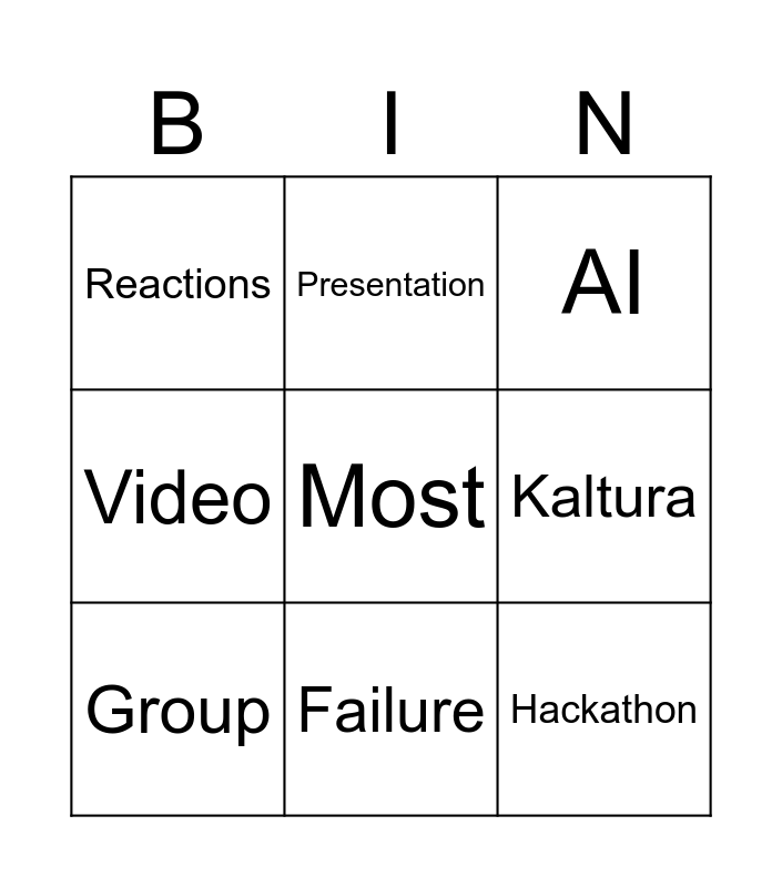 This bingo card has 31 words: Engaged, Chat, C&C, Game, Reactions, AI, Group, Leaderboard, Work, Team, Winner, Service, Board, Play, Comments, Jeans, Shoes, Water, Shirt, Change, Most, Emojis, Screen, Presentation, Hackathon, Kaltura, Video, Technology, Forward, Failure and Innovation.