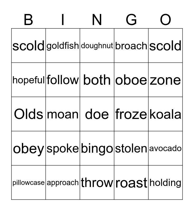 This bingo card has a free space and 24 words: spoke, approach, both, pillowcase, scold, scold, hopeful, goldfish, froze, bingo, oboe, Olds, stolen, avocado, follow, roast, koala, doughnut, zone, moan, holding, obey, broach and throw.