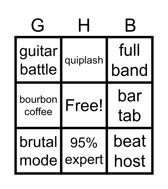 This bingo card has a free space and 8 words: bar tab, full band, quiplash, brutal mode, guitar battle, beat host, bourbon coffee and 95% expert.
