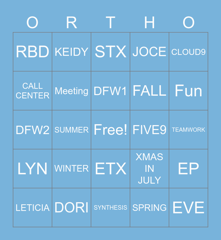 This bingo card has a free space and 24 words: LETICIA, WINTER, DFW1, SPRING, CLOUD9, RBD, KEIDY, STX, FIVE9, TEAMWORK, DFW2, Meeting, XMAS IN JULY, EP, CALL CENTER, DORI, SYNTHESIS, JOCE, Fun, LYN, SUMMER, ETX, FALL and EVE.