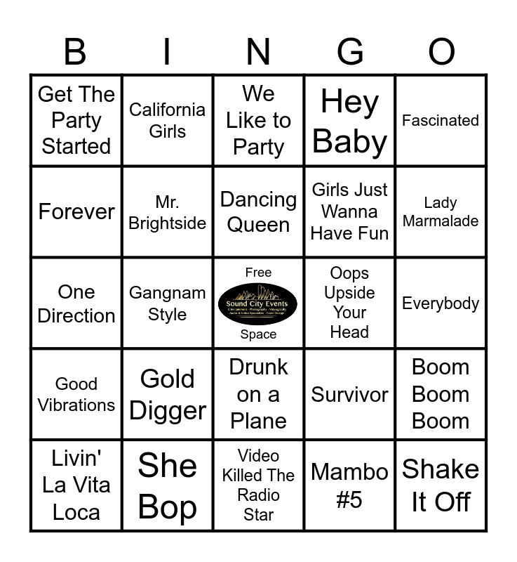 This bingo card has a free space and 64 words: 2 Legit 2 Quit, All Star, Banana Boat (Day-O), Boom Boom Boom, Bring It All Back, Cake By The Ocean, California Girls, Dancing In The Moonlight, Dancing Queen, Don't Cha, Drunk on a Plane, Evacuate The Dance Floor, Everybody, Fascinated, Fire Burning, Forever, Gangnam Style, Get The Party Started, Ghostbusters, Girls Just Wanna Have Fun, Gold Digger, Good Vibrations, Hey Baby, Hey Mickey, Hips Don't Lie, I Don't Feel Like Dancin', I wanna Dance With Somebody, I want it That Way, Ignition, It Wasn't Me, It's Tricky, Just a Friend, Karma Chameleon, Kung Fu Fighting, Lady Marmalade, Livin' La Vita Loca, Love Shack, Mambo #5, Monster Mash, Mr. Brightside, One Direction, Oops Upside Your Head, Oops, I Did It Again, Parents Just Don't Understand, Red Solo Cup, Shake It Off, She Bop, Stacy's Mom, Survivor, Tubthumping, Umbrella, Uptown Girl, Video Killed The Radio Star, Wake Me Up Before Up Go-Go, Walk Like an Egyptian, Wannabe, We Like to Party, We're Not Gonna Take It, Whip It, Who Do You Think You Are, Who Let The Dogs Out, Wild Wild West, You Can Call Me Al and You Sexy Thing.