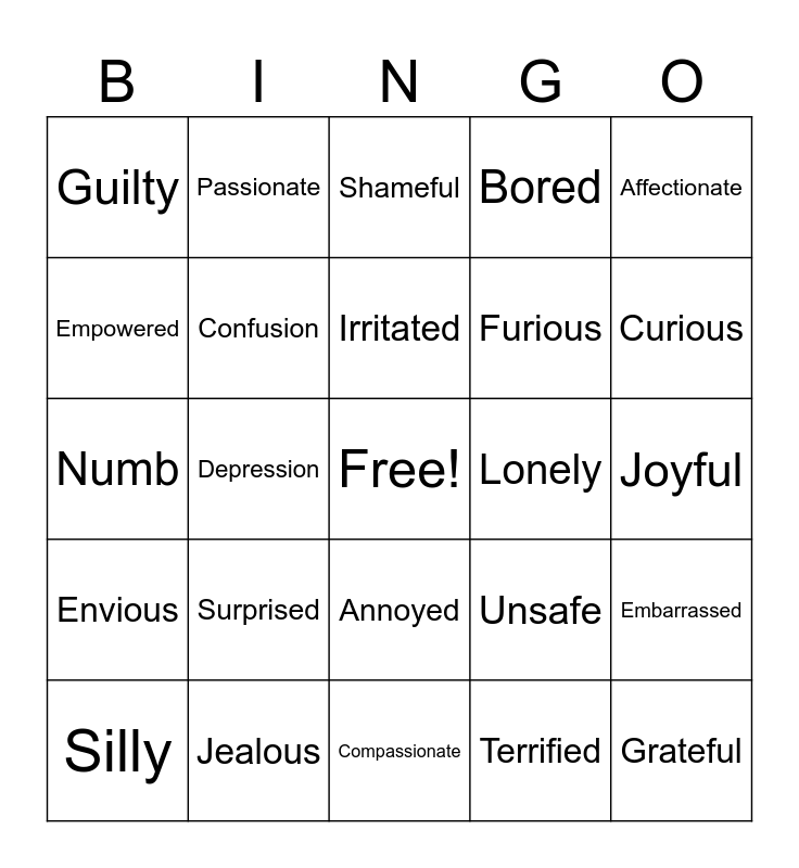 This bingo card has a free space and 29 words: Silly, Proud, Depression, Disgust, Guilty, Shameful, Confusion, Surprised, Lonely, Jealous, Joyful, Grateful, Compassionate, Terrified, Curious, Ashamed, Annoyed, Envious, Affectionate, Numb, Unsafe, Judgmental, Furious, Empowered, Bored, Passionate, Embarrassed, Irritated and Loyal.