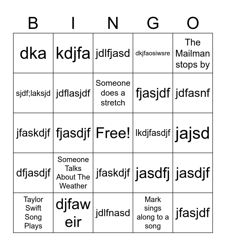 This bingo card has a free space and 24 words: Taylor Swift Song Plays, Someone Talks About The Weather, Someone does a stretch, Mark sings along to a song, The Mailman stops by, dka, kdjfa, jdlfjasd, lkdjfasdjf, jajsd, jfaskdjf, jdflasjdf, jasdfj, jasdjf, sjdf;laksjd, djfaw eir, jdlfnasd, dkjfaosiwsre, jdfasnf, dfjasdjf, fjasdjf, jfaskdjf, fjasjdf and jfasjdf.