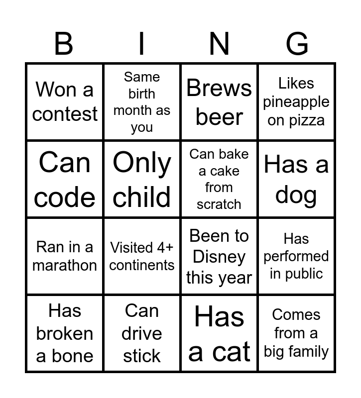 This bingo card has 16 words: Can drive stick, Has performed in public, Brews beer, Won a contest, Ran in a marathon, Same birth month as you, Been to Disney this year, Has a cat, Can code, Only child, Has broken a bone, Likes pineapple on pizza, Visited 4+ continents, Has a dog, Can bake a cake from scratch and Comes from a big family.
