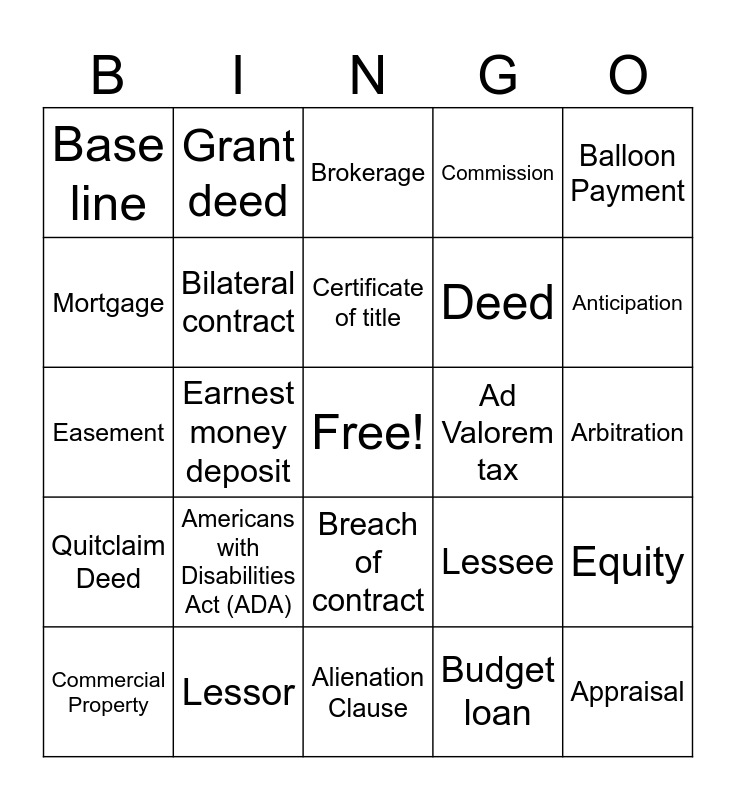 This bingo card has a free space and 24 words: Americans with Disabilities Act (ADA), Lessor, Certificate of title, Commercial Property, Balloon Payment, Base line, Mortgage, Grant deed, Ad Valorem tax, Breach of contract, Deed, Easement, Lessee, Equity, Bilateral contract, Budget loan, Arbitration, Brokerage, Anticipation, Earnest money deposit, Appraisal, Quitclaim Deed, Commission and Alienation Clause.