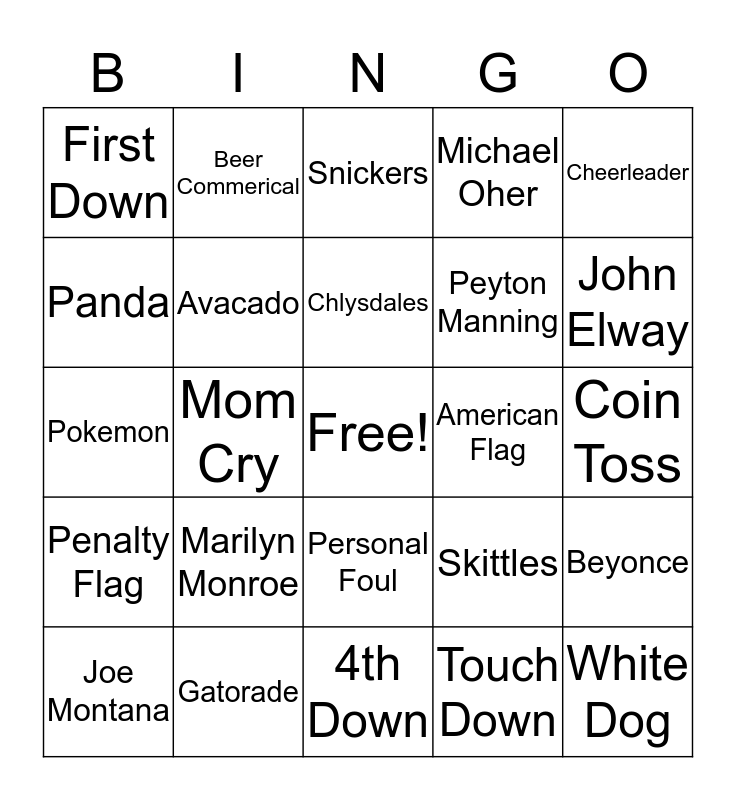 This bingo card has a free space and 24 words: Marilyn Monroe, Gatorade, Chlysdales, Joe Montana, Cheerleader, First Down, Panda, Beer Commerical, American Flag, Personal Foul, Peyton Manning, Pokemon, Skittles, Beyonce, Avacado, Touch Down, Coin Toss, Snickers, John Elway, Mom Cry, White Dog, Penalty Flag, Michael Oher and 4th Down.