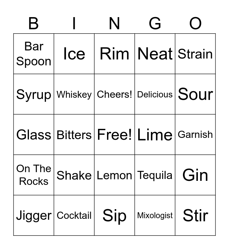This bingo card has a free space and 25 words: Shake, Sip, Cheers!, Jigger, Strain, Bar Spoon, Syrup, Ice, Lime, Lemon, Delicious, Glass, Tequila, Gin, Whiskey, Snacks, Garnish, Rim, Sour, Bitters, Stir, Cocktail, On The Rocks, Neat and Mixologist.