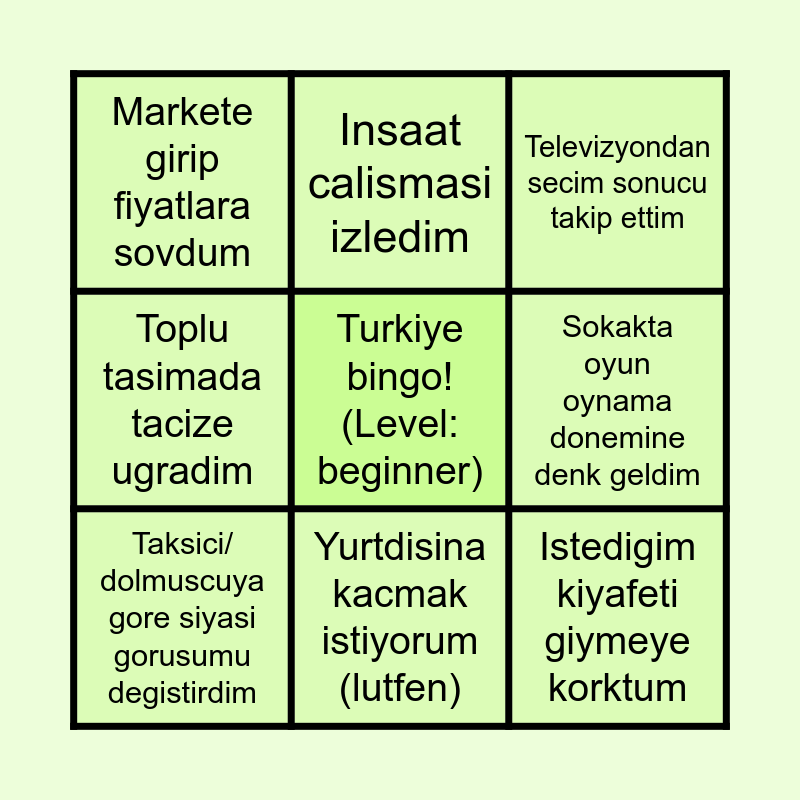 This bingo card has a free space and 8 words: Sokakta oyun oynama donemine denk geldim, Televizyondan secim sonucu takip ettim, Insaat calismasi izledim, Taksici/ dolmuscuya gore siyasi gorusumu degistirdim, Markete girip fiyatlara sovdum, Istedigim kiyafeti giymeye korktum, Toplu tasimada tacize ugradim and Yurtdisina kacmak istiyorum (lutfen).