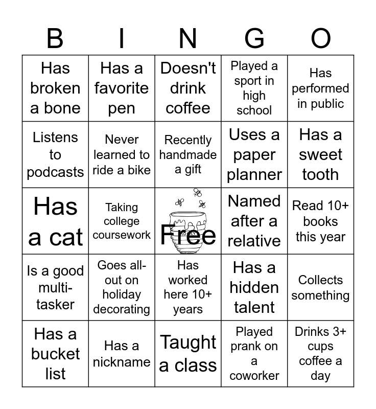 This bingo card has a free space and 38 words: Same birth month as you, Owns same car brand as you, Never flown on an airplane, Never learned to ride a bike, Collects something, Goes all-out on holiday decorating, Recently handmade a gift, Received an award, Has performed in public, Uses a paper planner, Taking college coursework, Played a sport in high school, Drinks 3+ cups coffee a day, Read 10+ books this year, Listens to podcasts, Is a good multi-tasker, Attended a Marion County Florida high school, Doesn't drink coffee, Is left-handed, Named after a relative, Has broken a bone, Has a nickname, Has a sweet tooth, Has a bucket list, Makes New Year’s resolutions, Taught a class, Had a secret admirer, Speaks 2+ languages, Owns a vacation house, Ran in a marathon, Has a snack stash, Has worked here 10+ years, Played prank on a coworker, Has a favorite pen, Has 0 unread emails, Has a hidden talent, Has a cat and Has ridden a horse.