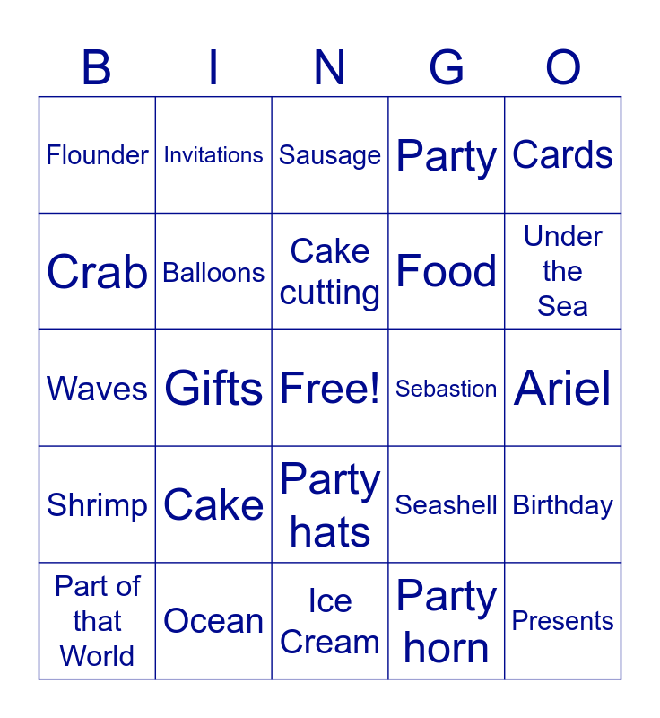 This bingo card has a free space and 38 words: shrimp, part of that world, pizza, Balloons, Birthday, Cake, Cake cutting, Candles, Cards, Food, Gifts, Party, Presents, Ariel, Crab, Shrimp, Potatoes, Sausage, Corn, Sebastion, Flounder, Ocean, Under the Sea, Part of that World, Fish, Ice Cream, Confetti, Music, Tiara, Candy, Gift Bag, Party hats, Party horn, Invitations, Ursula, Seashell, Waves and 17.