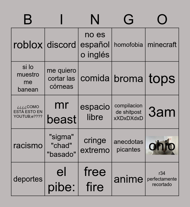 This bingo card has 1 images, a free space and 24 words: "sigma" "chad" "basado", el pibe:, comida, deportes, minecraft, roblox, si lo muestro me banean, discord, compilacion de shitpost xXDxDXdxD, cringe extremo, broma, ¿¿¿¿COMO ESTÁ ESTO EN YOUTUB;e????, anecdotas picantes, ohio, me quiero cortar las córneas, anime, 3am, no es español o inglés, tops, mr beast, r34 perfectamente recortado, racismo, homofobia and free fire.
