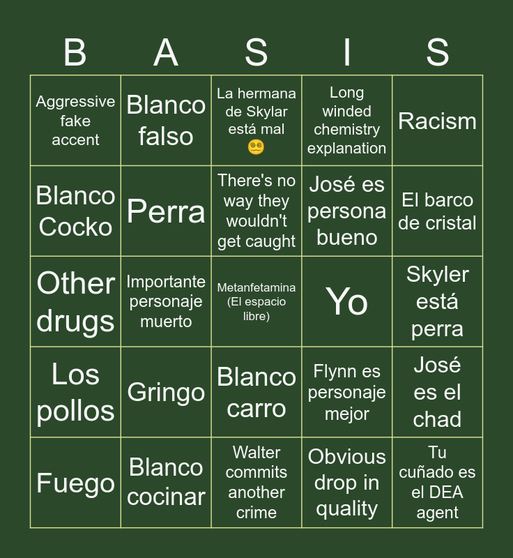 This bingo card has a free space and 26 words: Blanco carro, Obvious drop in quality, There's no way they wouldn't get caught, Blanco cocinar, Racism, Aggressive fake accent, Blanco Cocko, Blanco falso, Skyler está perra, Flynn es personaje mejor, José es persona bueno, Other drugs, José es el chad, Fuego, Importante personaje muerto, Cerdos, Long winded chemistry explanation, Los pollos, La hermana de Skylar está mal 😵💫, Tu cuñado es el DEA agent, El barco de cristal, Walter commits another crime, Yo, Gringo, Perra and Una compra cara.