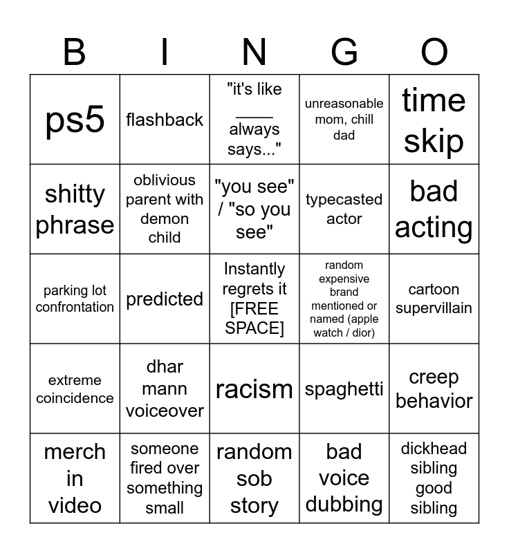 This bingo card has a free space and 25 words: dhar mann voiceover, random sob story, "you see" / "so you see", merch in video, time skip, ps5, shitty phrase, flashback, random expensive brand mentioned or named (apple watch / dior), racism, typecasted actor, parking lot confrontation, spaghetti, creep behavior, oblivious parent with demon child, kids with ipad, cartoon supervillain, "it's like ____ always says...", bad acting, predicted, dickhead sibling good sibling, someone fired over something small, extreme coincidence, unreasonable mom, chill dad and bad voice dubbing.
