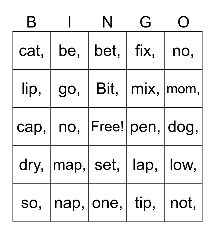 This bingo card has a free space and 33 words: try,, hi,, no,, she,, dry,, go,, no,, so,, be,, we, Bit,, bet,, met,, pin,, pen,, mom,, nap,, cap,, map,, lap,, set,, met,, cat,, dog,, one,, not,, fix,, mix,, lip,, low,, pit,, tip, and kit.