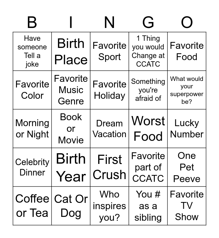 This bingo card has a free space and 24 words: Birth Year, Cat Or Dog, Favorite Holiday, Coffee or Tea, Favorite Food, Have someone Tell a joke, Favorite Color, Birth Place, Worst Food, First Crush, Something you're afraid of, Morning or Night, Favorite part of CCATC, One Pet Peeve, Favorite Music Genre, You # as a sibling, Lucky Number, Favorite Sport, What would your superpower be?, Book or Movie, Favorite TV Show, Celebrity Dinner, 1 Thing you would Change at CCATC and Who inspires you?.