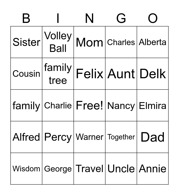 This bingo card has a free space and 40 words: delk, family, fun, family tree, George, Warner, Felix, Mary, Alberta, Alfred, Charlie, Charles, Annie, Elmira, Nancy, Percy, Together, Sister, Brother, Mom, Dad, Uncle, Aunt, Cousin, Friends, United, Grandchildren, Happy, Love, Joy, God, Wisdom, Fun, Together, Delk, Travel, Play, Water, Volley Ball and Park.